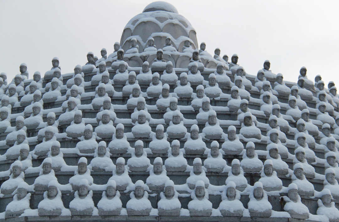 9일 충북 옥천군 군북면 보륜사(普輪寺) 경내의 천불상(千佛像)에 하얀 눈이 소복이 내려앉았다. 전날부터 내린 눈이 돌부처 머리와 어깨 위에 쌓이면서 눈 속 수행을 하는 듯한 모습을 연출하고 있다.
