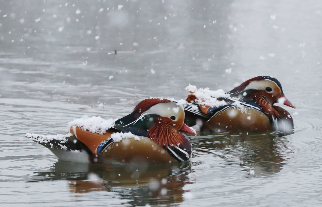 광주·전남에 최고 3㎝의 눈이 내린 9일 오전 광주 북구 전남대학교 내 연못을 거니는 천연기념물 제327호 원앙 몸 위로 눈이 쌓이고 있다.