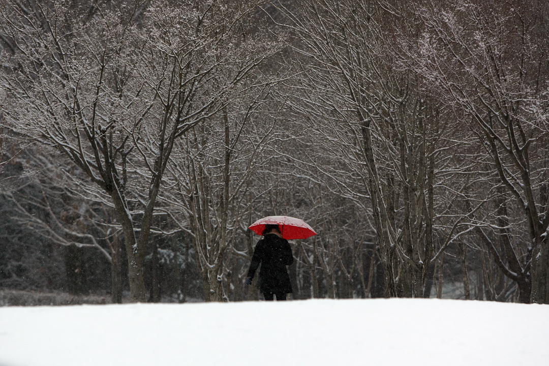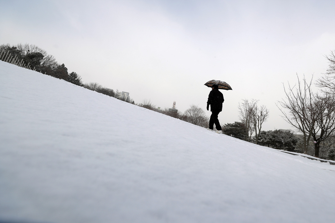 전국 곳곳에 대설특보가 내려진 9일 오전 광주 서구 쌍촌동 5·18기념공원에서 우산 쓴 시민이 눈 쌓인 산책로를 걷고 있다.