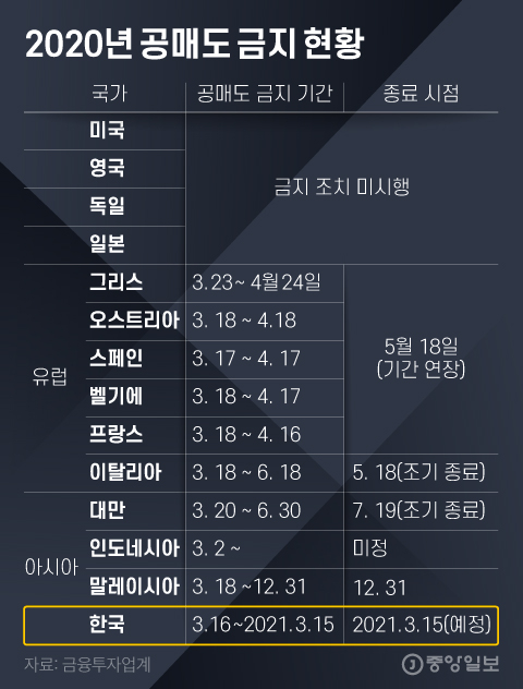 2020년 공매도 금지 현황. 그래픽=김영희 02@joongang.co.kr