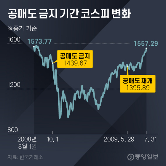 반론도 있다. 황세운 자본시장연구원 연구위원은 “세계금융위기와 유럽재정위기 때인 2008년과 2011년 두 차례 공매도를 중단했다 재개했을 때도 주가 하락은 없었다”며 “최근의 국내 주가 상승을 이끄는 대형주에 공매도가 집중될 가능성이 적은 만큼 대규모 주가 하락은 어려울 것”이라고 말했다.