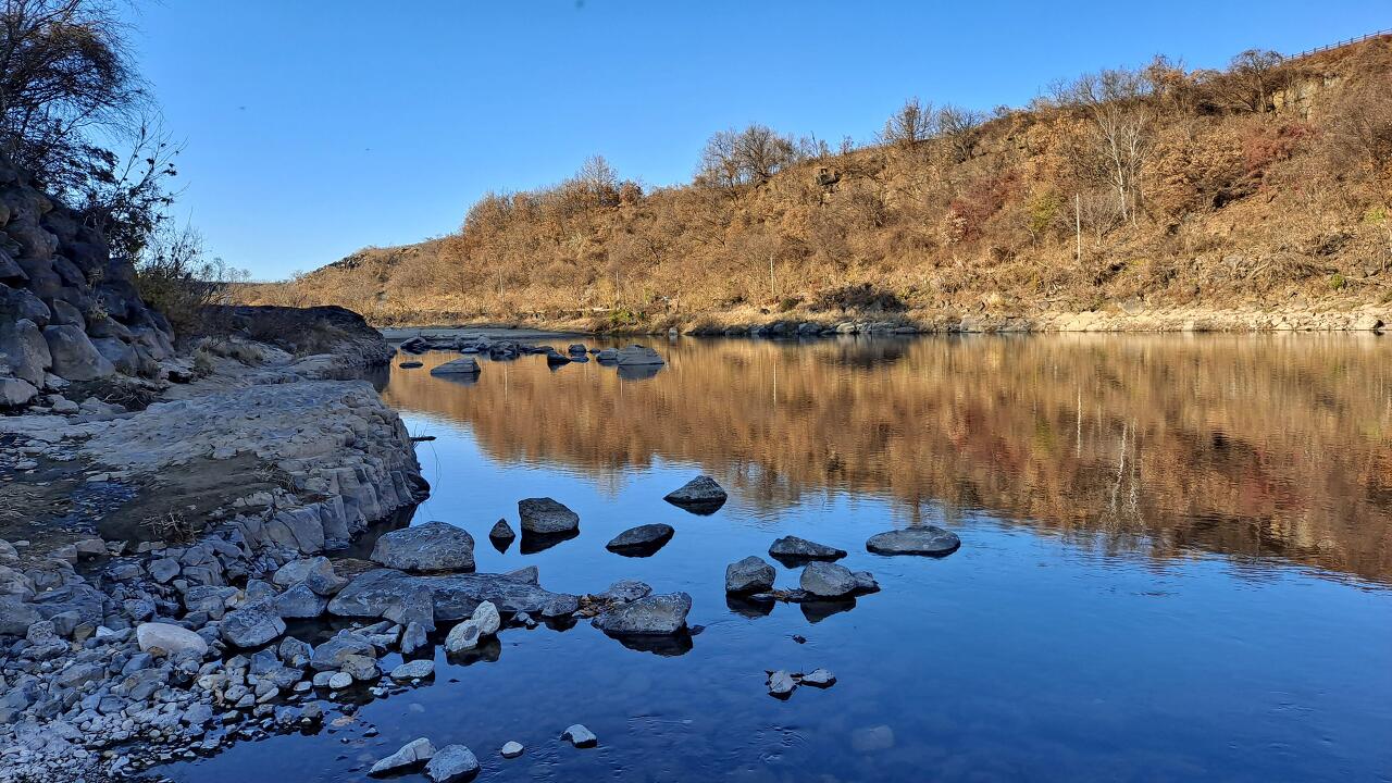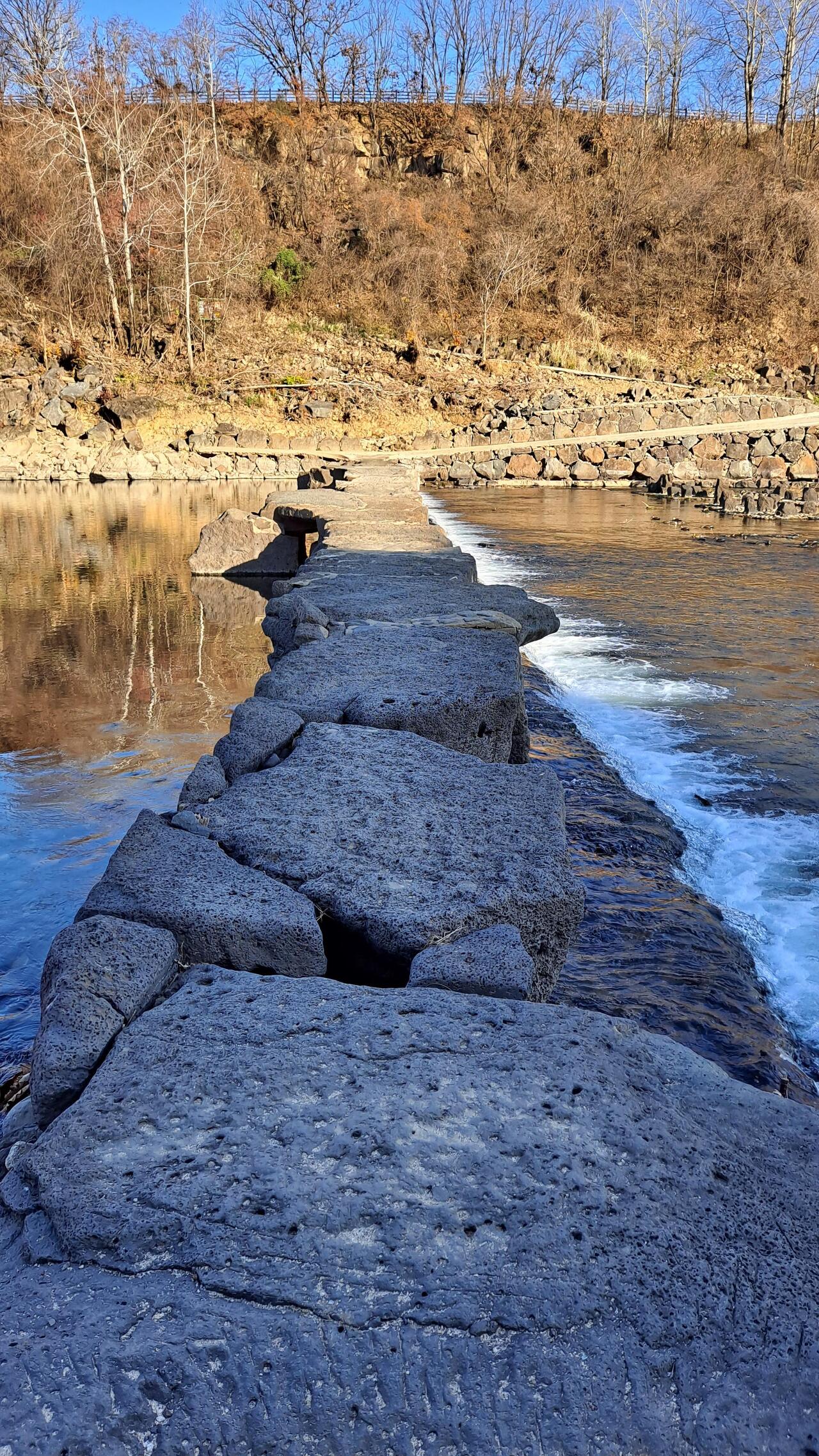 현무암 돌다리를 한 발 한 발 건너는데 새파란 하늘 아래로