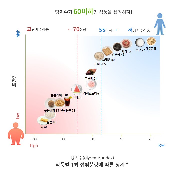 당지수는 섭취 당시에 혈당이 상승하는 속도를 나타낸 수치다. 혈당을 빠르게 상승시키는 콜라, 도넛, 과자처럼 단 음식들은 당지수가 높은 식품에 속하기 때문에 당연히 피하는 것이 좋다.