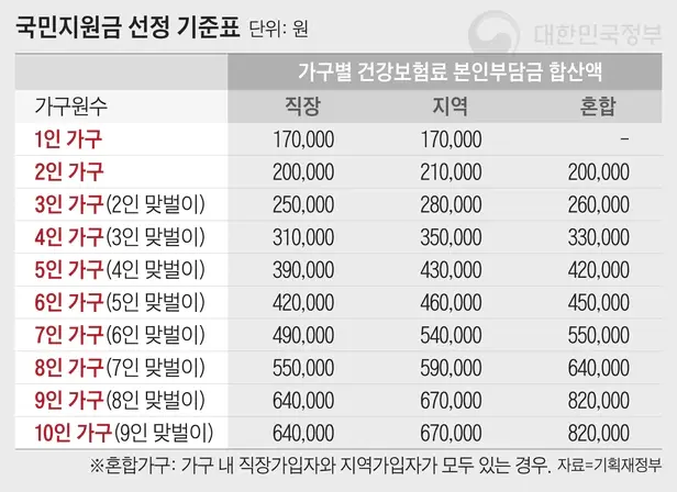 맞벌이 가구의 경우 가구원 수가 한 명 더 있는 것으로 보고 지원금을 지급한다. 예를 들어 직장 가입자 기준 2인 맞벌이 가구는 3인 외벌이 가구 기준과 같은 25만원, 3인 맞벌이 가구는 31만원, 4인 맞벌이 가구는 39만원 이하면 지원금 지급 대상이 된다. 가구 구성은 지난 6월 30일 기준 세대별 주민등록표로 따진다.