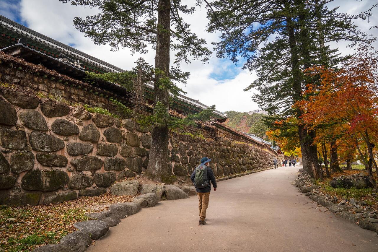 돌담하면 덕수궁의 돌담이 떠오르는데, 검게 변한 신흥사의 돌담과 붉은 단풍 속에 홀로 초록의 잎을 안고 있는 전나무는 예상치 못한 아름다음으로 다가온다.