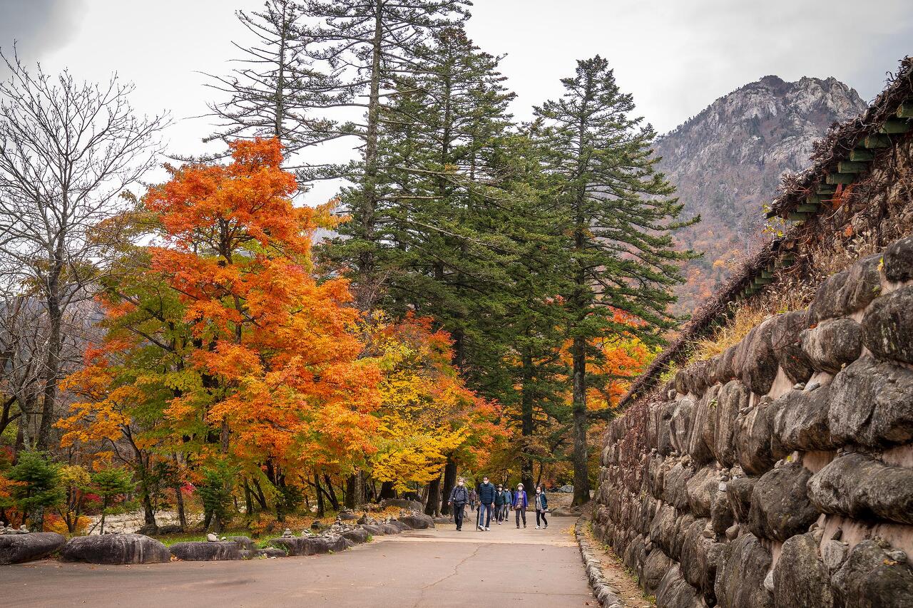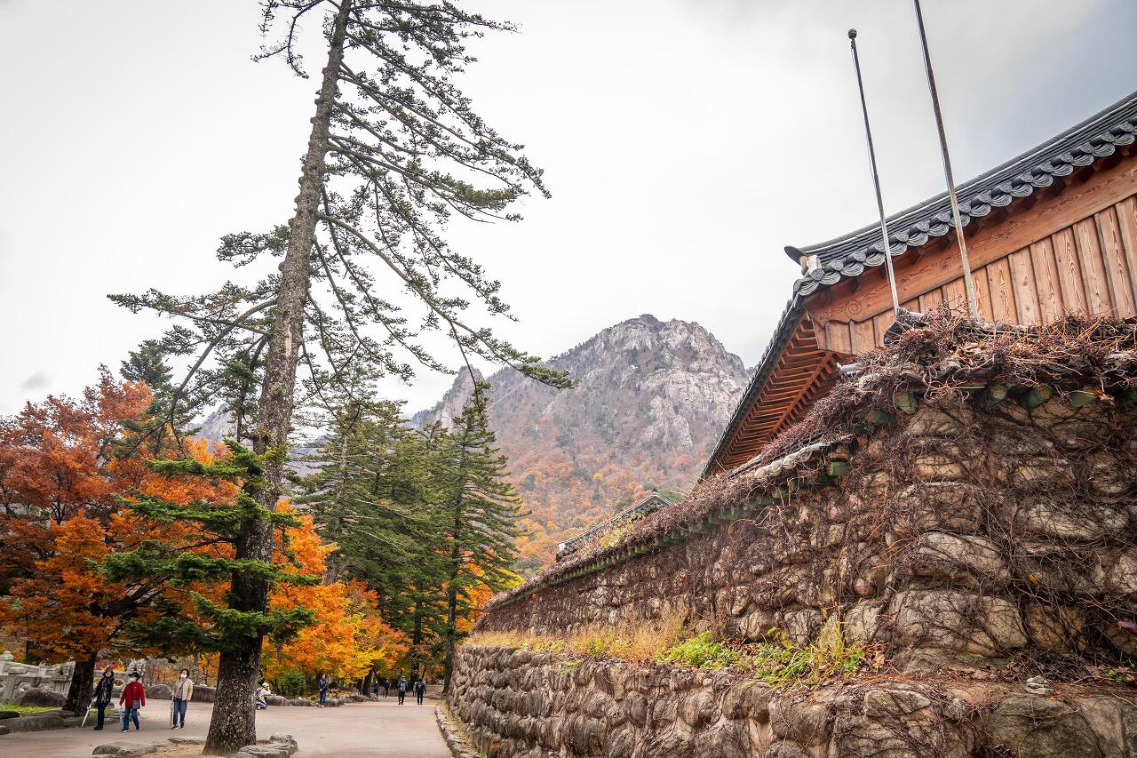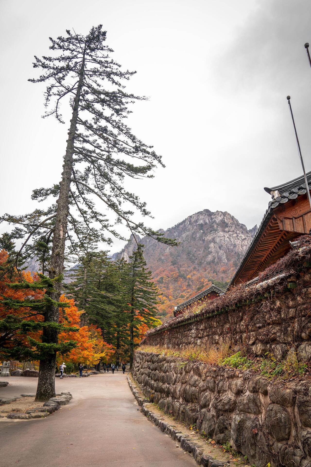 신흥사와 달마봉 사이를 흐르는 洗心川(세심천)에서 가져온 것인지, 설악의 하천에만 있는 커다란 둥근 돌로 담장을 만들었기에 보다 자연스러웠으며, 담장너머로 보이는 전각들의 검은 지붕은 설악의 천년고찰 신흥사임을 알려주는 가운데, 앞으로는 억겁의 세월을 안고 있는 설악의 권금성과 노적봉이 보이고, 옆으로는 붉은 단풍과 대비되는 커다란 전나무 있어, 설악만이 갖는 색다른 아름다움을 자아내고 있었기에 여행에 즐거움을 더하여 주고 있었다.