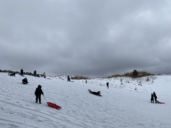 산 중턱에는 천연 눈썰매장…“동심 가득”