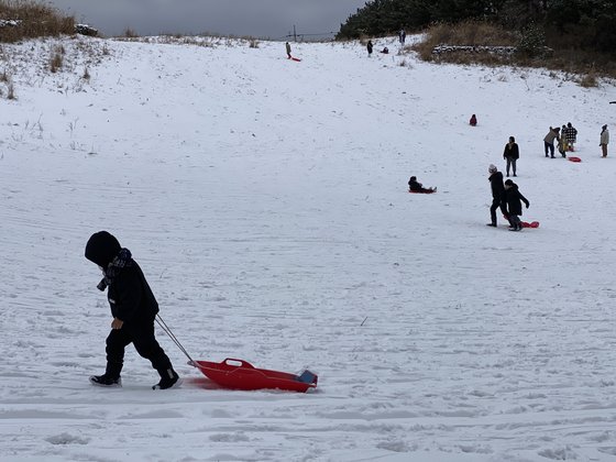 산 중턱 곳곳은 천연 눈썰매장이 됐다. 남녀노소를 가리지 않고 산 곳곳에서 썰매를 타는 관광객들이 눈에 띄었다. 위선영(36·제주시)씨는 “워낙 눈이 많이 내려서인지 눈썰매를 타다 넘어져도 아프지 않은 것 같다”며 “친구들 모두 동심으로 돌아간 기분인지 웃음이 끊이질 않고 있다”고 했다.