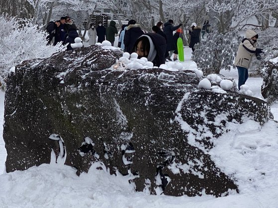 이날 산 곳곳에서는 눈사람이 만들어졌다. 최근 인기를 모으고 있는 ‘눈오리’를 만드는 장면도 여러곳에서 목격됐다. 폭설로 인해 주요 5개 등반로가 모두 통제된 만큼 차량진입이 가능한 곳을 중심으로 탐방객이 몰렸다.