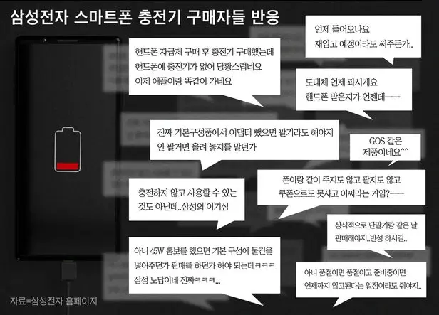 실제 삼성전자가 충전기를 구매하기 위한 스마트폰 구매자들이 줄을 이었다. 삼성전자 스마트폰 판매 홈페이지를 보면 소비자들은 “충전 선만 있고 충전기는 빼놓고 충전기를 안 팔면 어떻게 하냐”, “기본 구성품에서 어댑터 뺐으면 팔기라도 해야지 안 팔 거면 올려놓지 말던가”, “구성품에서 충전기를 빼면 실사용 어떻게 하라고”, “단말기만 판매하고 충전기는 따로 구매하라는 건 이기심” 등의 반응을 보였다. 일부 충전기의 경우 물량 부족으로 판매가 제때 이뤄지지 않은 경우도 다수 있는 것으로 파악된다.