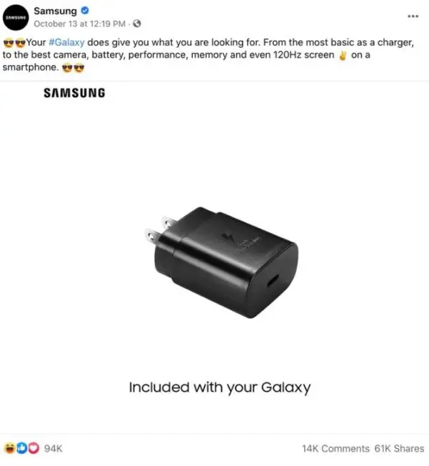 정보기술(IT) 전문매체 샘모바일은 이달 초 “삼성전자가 앞으로 모든 스마트폰의 구성품에서 충전기 어댑터를 제외할 수 있다”라고 전망했다. 폰아레나 역시 “올해 출시될 갤럭시A 시리즈는 모두 충전기 없이 출시될 것이며 모든 스마트폰 구성품에서 충전기 어댑터를 제외할 수 있다”고 했다.