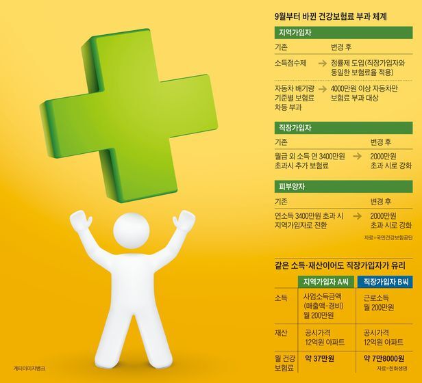 예를 들어 연간 금융소득(이자+배당소득)이 1100만원이고 국민연금 연간 수령액이 1080만원(월 90만원)뿐인 은퇴자라면 연 소득이 2000만원이 넘어 9월부터 피부양자에서 탈락해 지역가입자로 전환된다. 강화된 내용은 이미 시행됐지만 국세청의 소득 파악과 지자체의 재산 파악 내역이 건보공단에 통보되는 시간 차를 고려하면 피부양자에서 탈락하거나 건보료가 오르는 사례는 앞으로 더 많이 생길 것으로 예상된다.