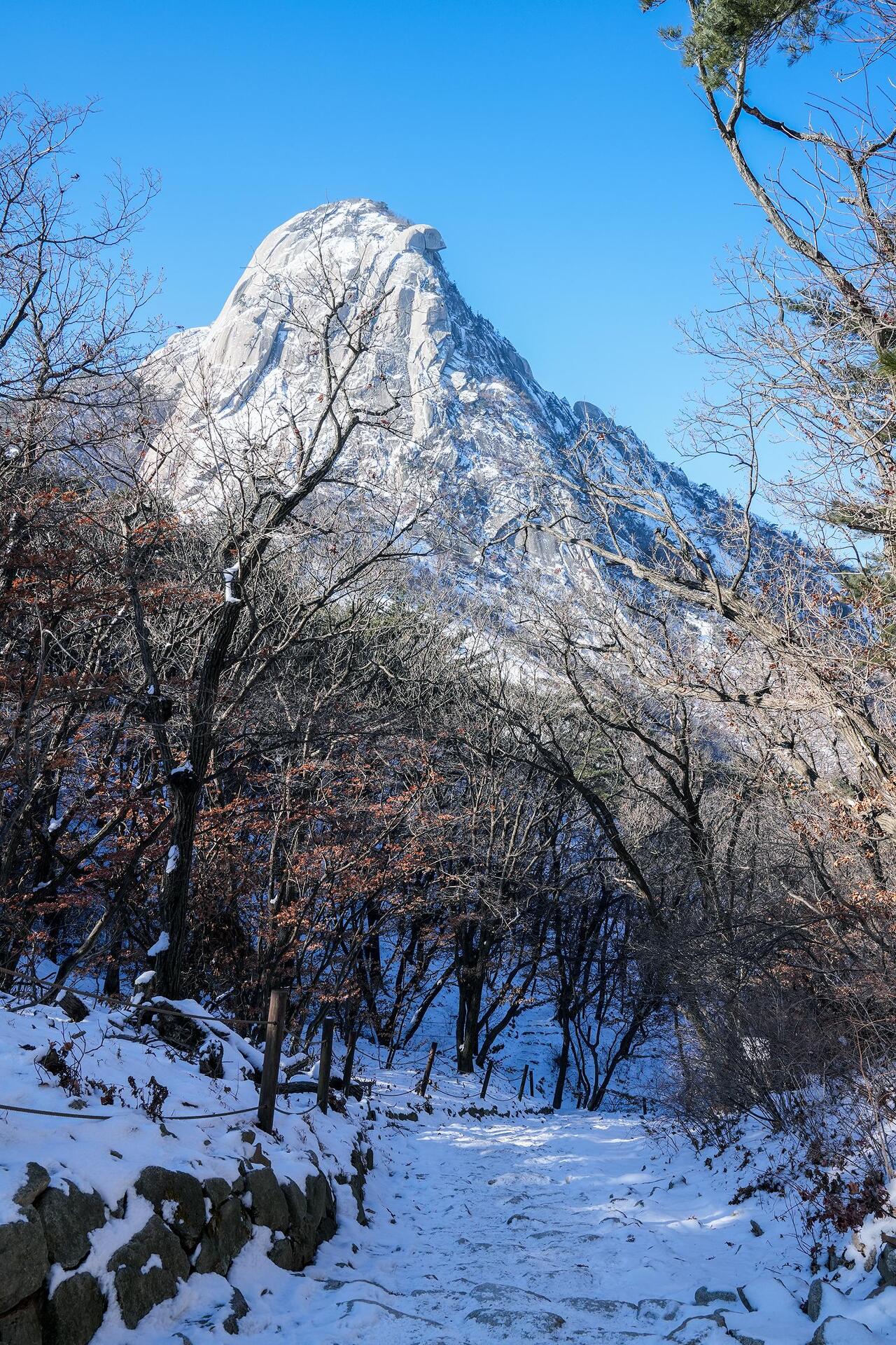 1월27일, 요즈음 Tennis를 하지 않아서인지, 허리와 무릎에 통증이 줄어들었기에 삼각산이라 불리기도 하는 북한산을 찾았고, 정상부를 이루고 있는 인수봉의 설경을 담을 수 있었다. 해발 810m의
