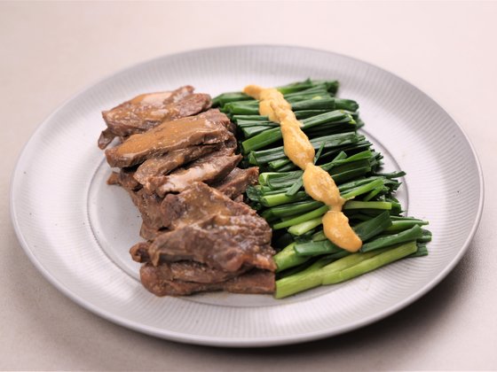 쿠킹이 육우자조금관리위원회와 준비한 사태 된장 조림. 데친 쪽파, 알싸한 겨자 소스를 곁들여 먹는다. 사진 쿠킹
