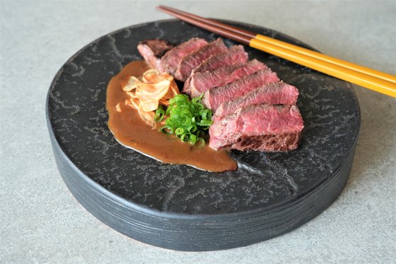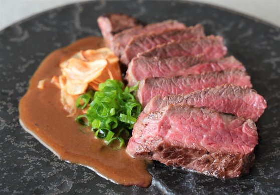 쿠킹이 육우자조금관리위원회와 준비한 한식 메뉴인 간장겨자소스를 육우 채끝구이. 부드러운 고기와 매콤하면서도 감칠맛 도는 소스의 조화가 일품이다. 사진 윤지아
