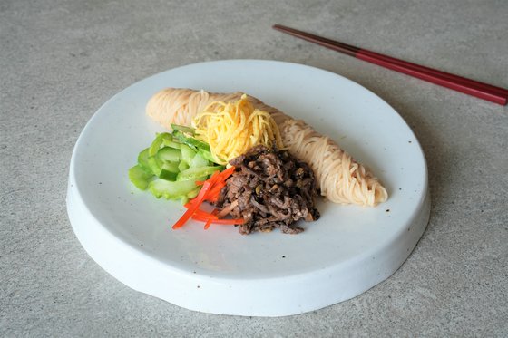 8. 불고기를 반쯤 덜어 소면과 잘 비벼 섞는다. 비빔 간장으로 기호에 따라 간을 맞추고 달걀지단과 불고기, 볶은 오이, 홍고추를 고명으로 얹어낸다.