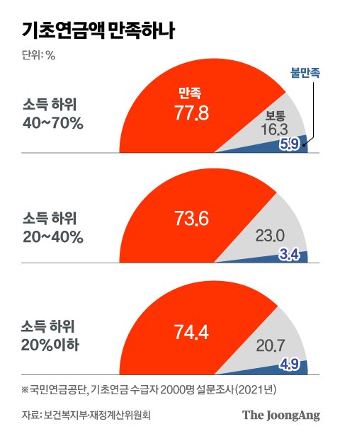 국민연금공단이 2021년 기초연금 수급자 2000명을 설문조사 했을 때 이런 답변이 나왔다. 기초연금은 65세 노인 70%에게 지급한다. 노인들은 "생활의 안전판" "자녀 같다" "보험이다”라고 표현했다. 어떤 노인은 "기초연금이 안 나오면 엄청난 타격이 와서 자녀에게 손을 벌려야 할 것"이라고 우려했다.