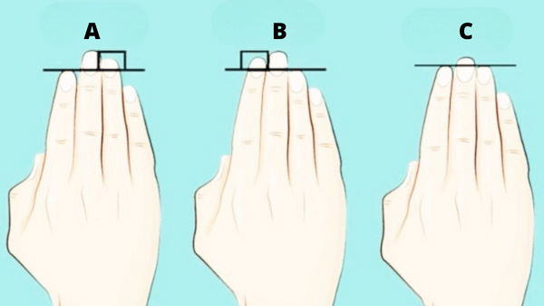 약지와 검지의 길이 이외에도 새끼손가락의 길이 또한 사람의 성격을 나타내 줍니다. 새끼손가락의 길이를 약지의 윗부분 라인과 비교해 보면 어떤 사람의 단호함, 충성심, 그리고 그 사람이 놀라움에 대해 어떻게 다루는지에 대한 인사이트를 알아볼 수 있습니다. 그리고 이에 대해서도 A, C, B 이렇게 세 가지의 유형이 있습니다.