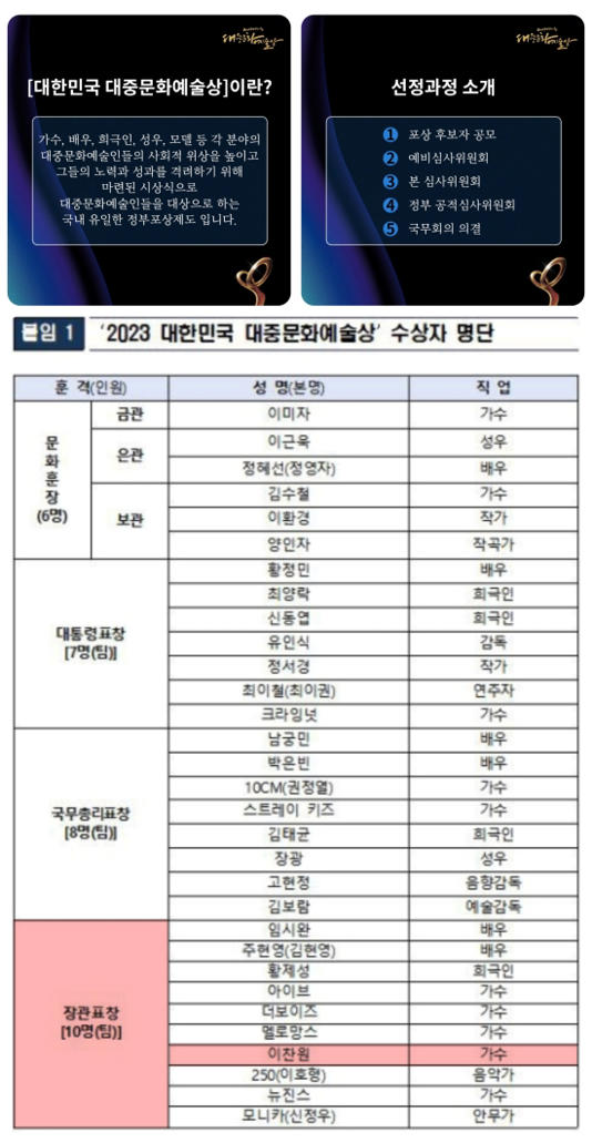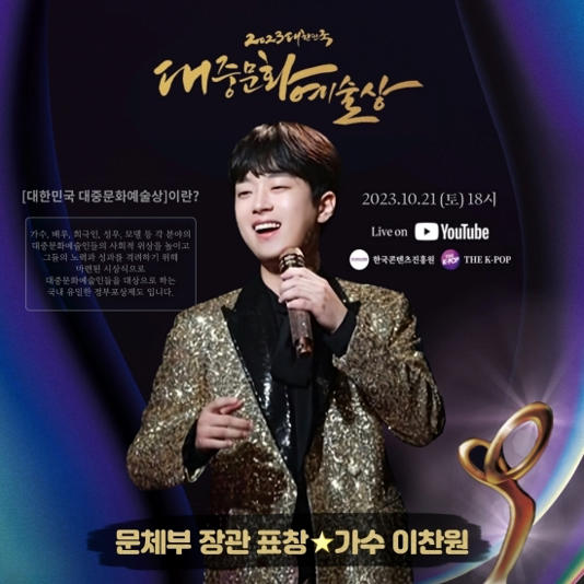 한편, '2023 대한민국 대중문화예술상' 시상식은 콘진원과 '더 케이팝' 유튜브 채널을 통해 온라인으로도 생중계된다.