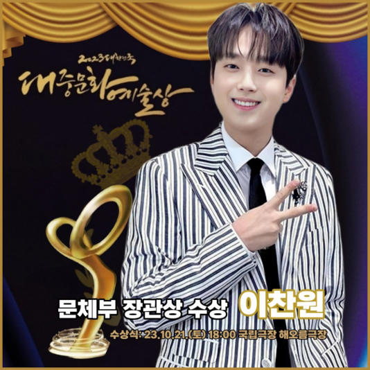 가수 이찬원이 2023 대한민국 대중문화예술상에서 문화체육관광부 장관상 표창을 받는다.