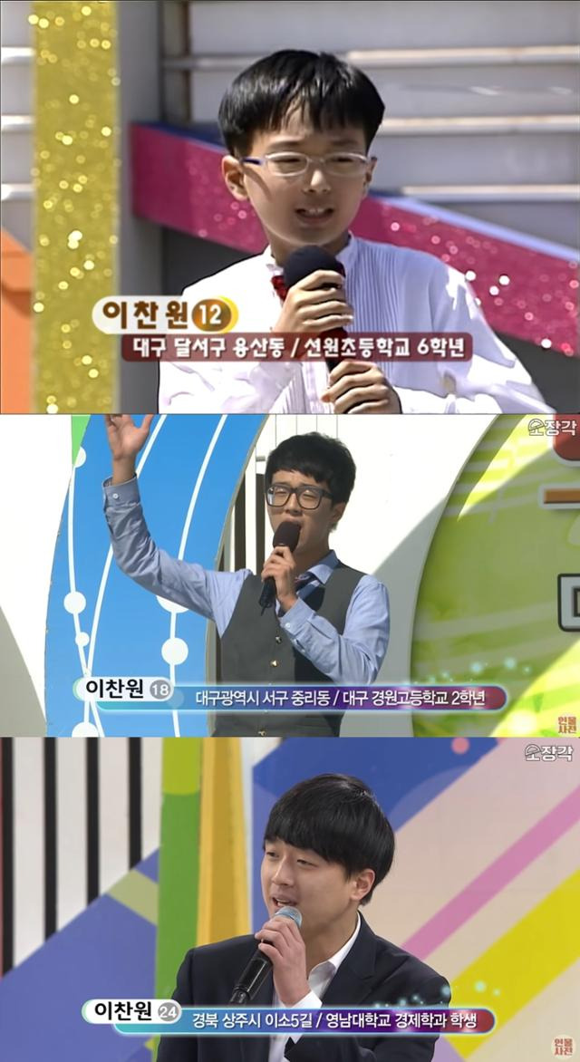 이찬원이 초등학생, 고등학생, 대학생 때 KBS '전국노래자랑'에 출연한 모습. KBS 유튜브 캡처