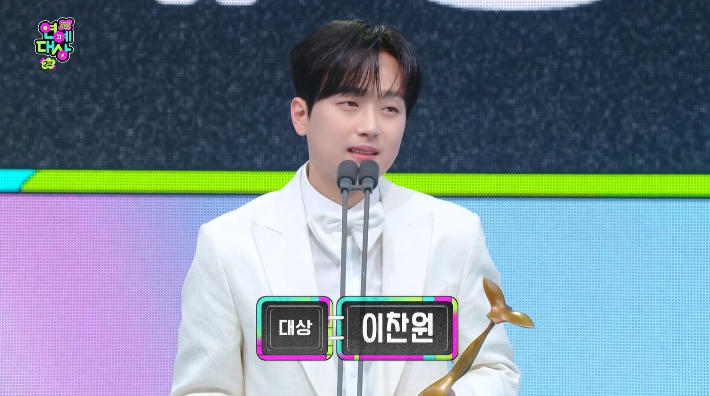 올해 대상의 주인공은 이찬원이었다. 이날 MC를 봤던 이찬원은 이름이 불리자 예상치 못했다는 듯 고개를 숙이는 모습으로 눈길을 끌었다. 2022~2023년에는 수상 가능성이 있지 않을까 해서 남몰래 수상소감을 준비했지만, 올해는 전혀 예상하지 못했다고 털어놨다.