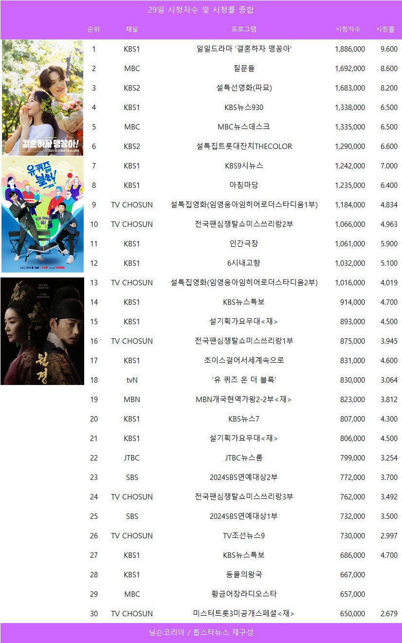 | 역시 '이찬원 파워'…'트롯대잔치', 설 연휴 예능 시청률 1위 [공식] (0) | 2025.01.31 |
